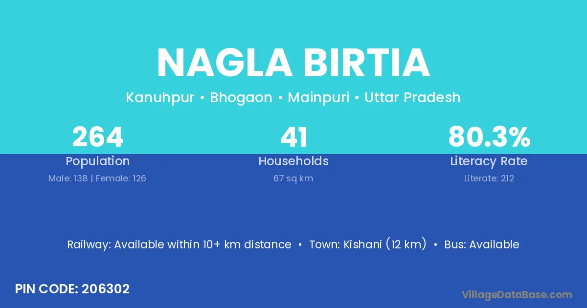 Kishani (12 km) is the nearest town to Nagla Birtia village for major economic activities and is located approximately 12 km away.
