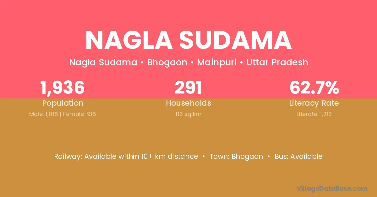 Nagla Sudama village has a total population of 1,936 people, of which 1,018 are males and 918 are females.
