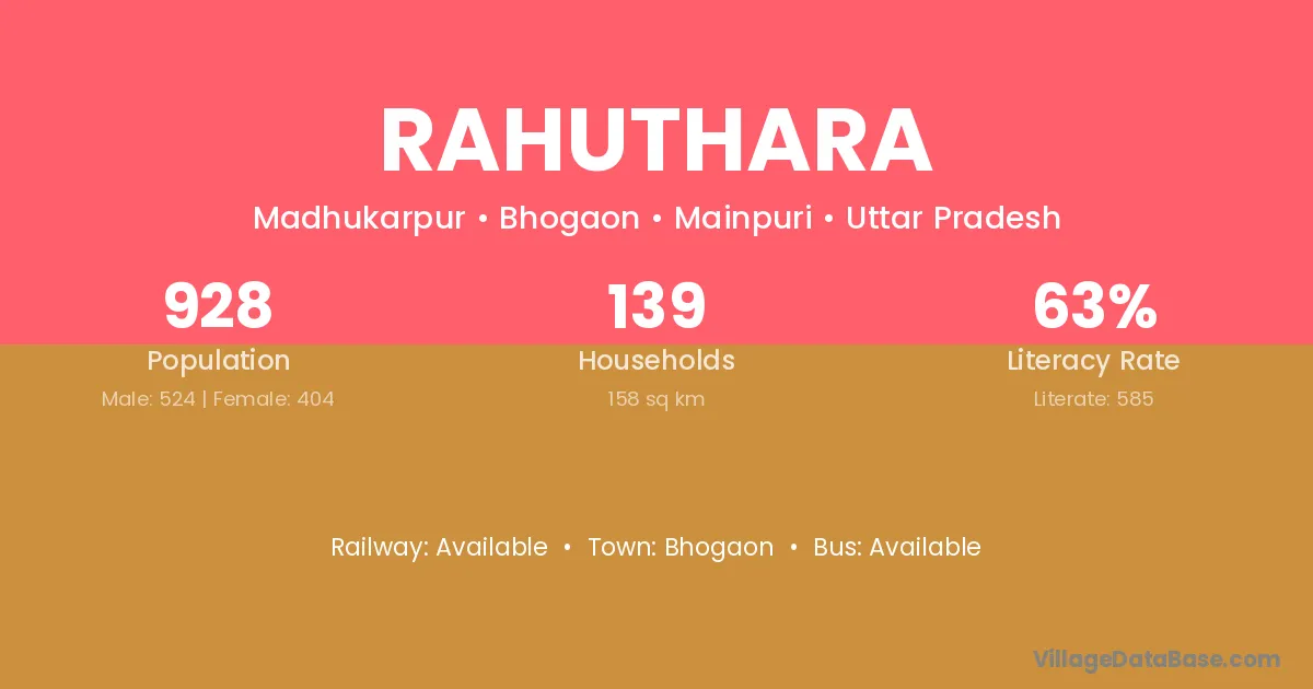 Rahuthara village has a total population of 928 people, of which 524 are males and 404 are females.