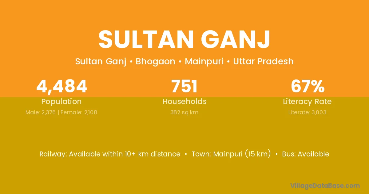 Mainpuri (15 km) is the nearest town to Sultan Ganj village for major economic activities and is located approximately 15 km away.