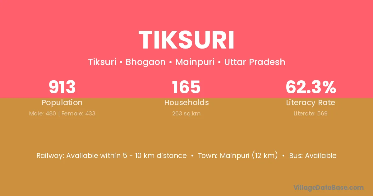 Mainpuri (12 km) is the nearest town to Tiksuri village for major economic activities and is located approximately 12 km away.