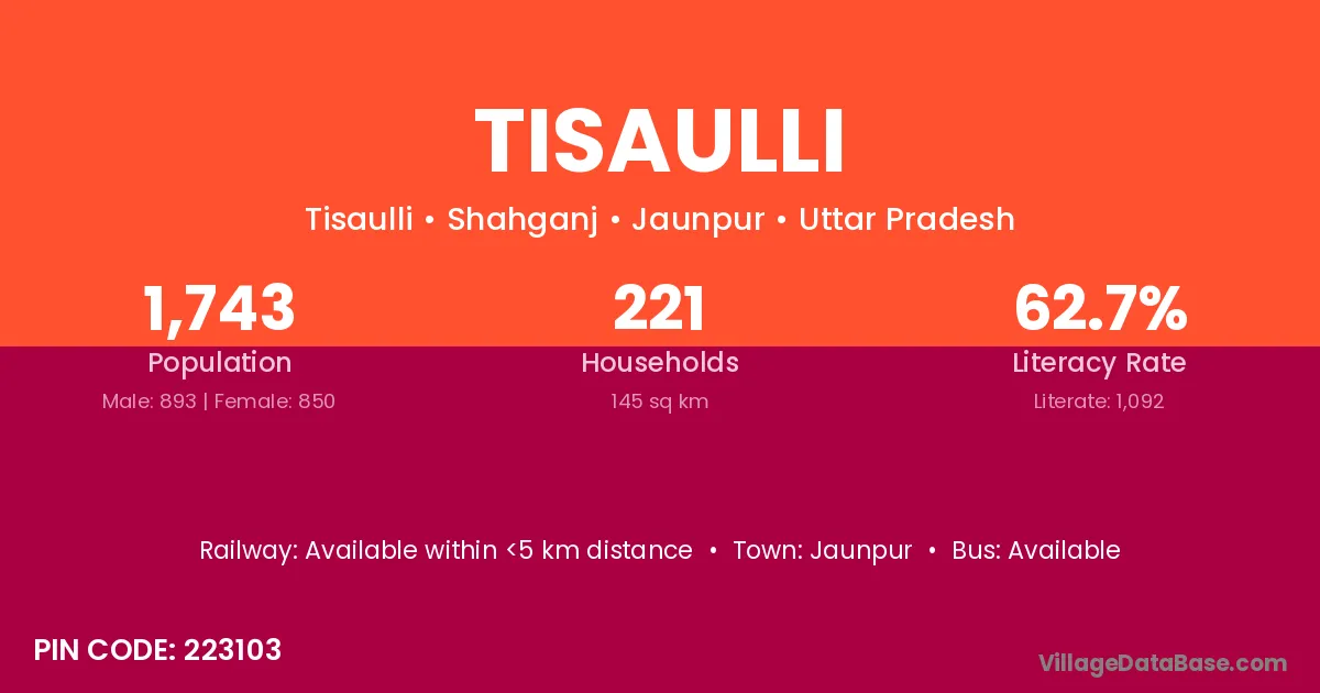 The literacy rate of Tisaulli village is 64.34%. Male literacy stands at 73.06% and female literacy at 54.32%.