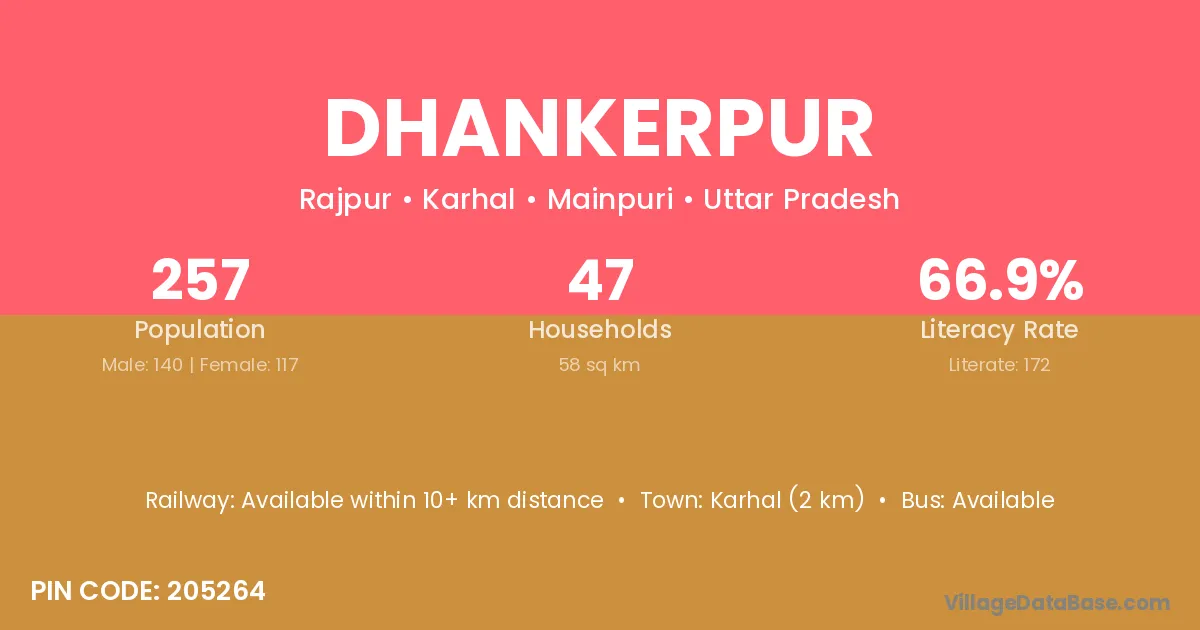 Karhal (2 km) is the nearest town to Dhankerpur village for major economic activities and is located approximately 2 km away.