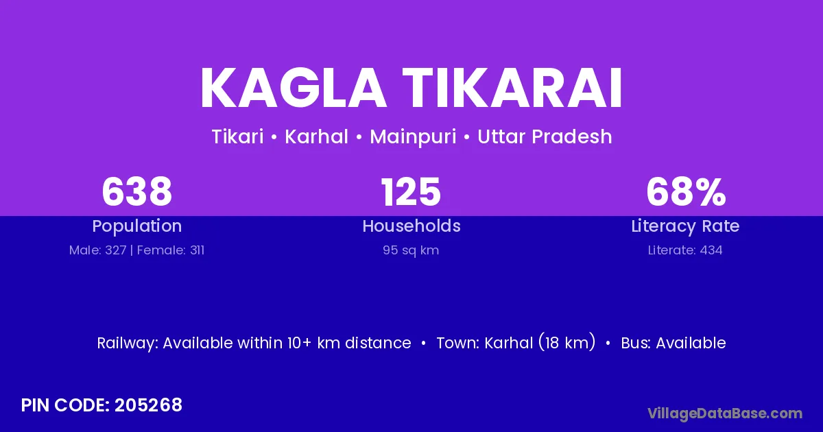 Karhal (18 km) is the nearest town to Kagla Tikarai village for major economic activities and is located approximately 18 km away.