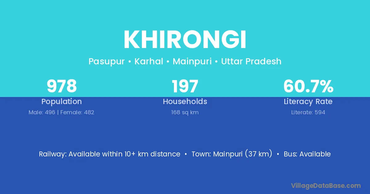 Mainpuri (37 km) is the nearest town to Khirongi village for major economic activities and is located approximately 37 km away.
