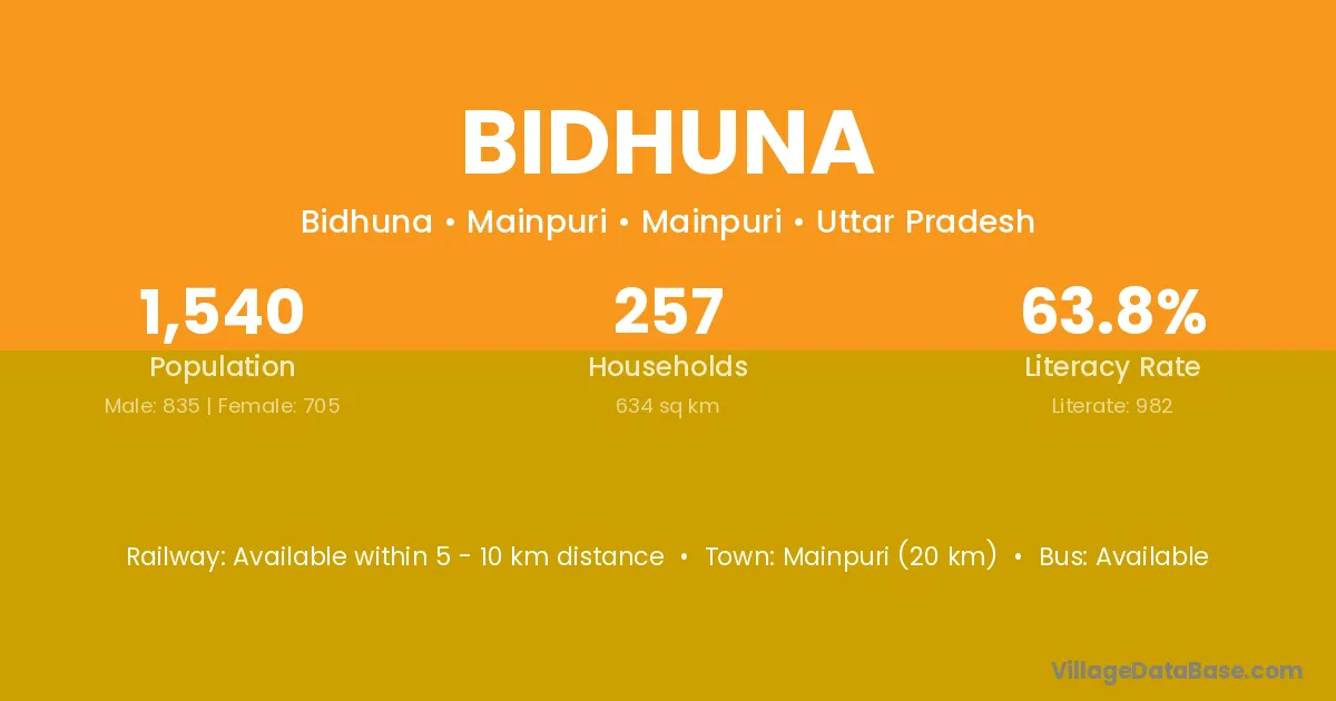 Mainpuri (20 km) is the nearest town to Bidhuna village for major economic activities and is located approximately 20 km away.