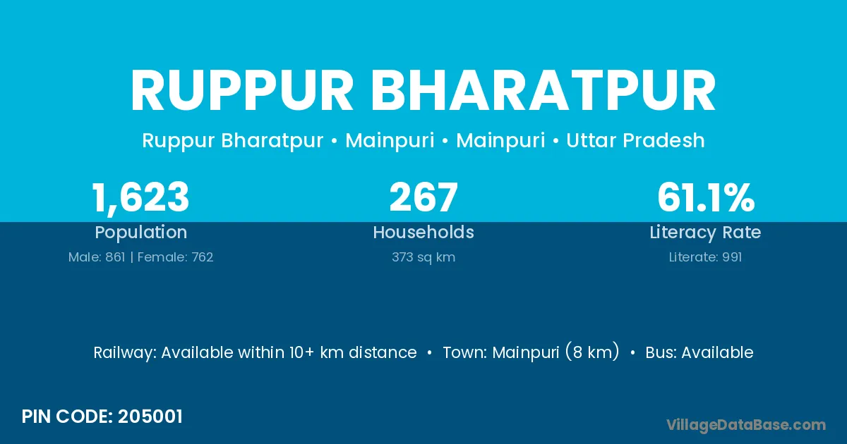Mainpuri (8 km) is the nearest town to Ruppur Bharatpur village for major economic activities and is located approximately 8 km away.