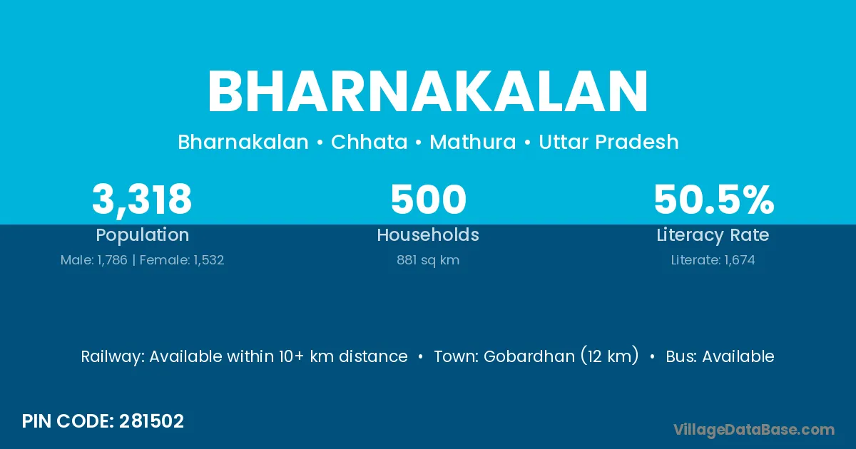 Gobardhan (12 km) is the nearest town to Bharnakalan village for major economic activities and is located approximately 12 km away.