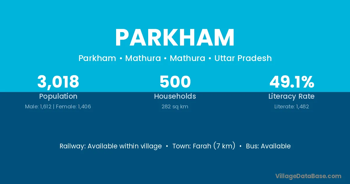 Vrindavan (10 km) is the nearest town to Parkham village for major economic activities and is located approximately 10 km away.