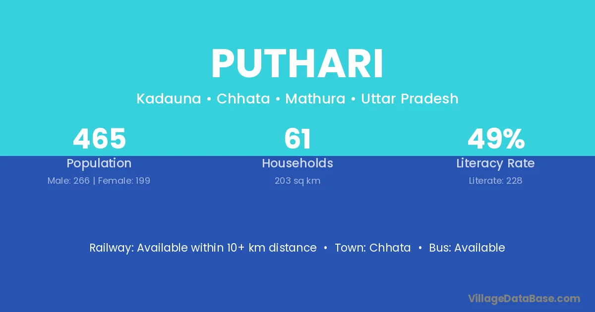 Puthari village has a total population of 465 people, of which 266 are males and 199 are females.