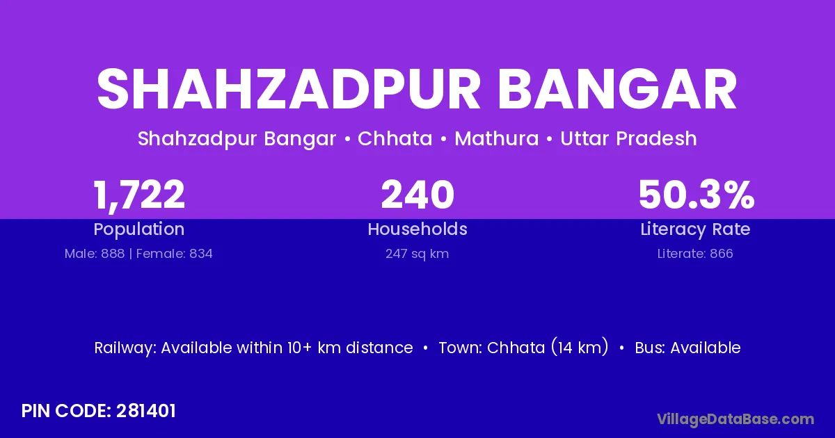 Chhata (14 km) is the nearest town to Shahzadpur Bangar village for major economic activities and is located approximately 14 km away.