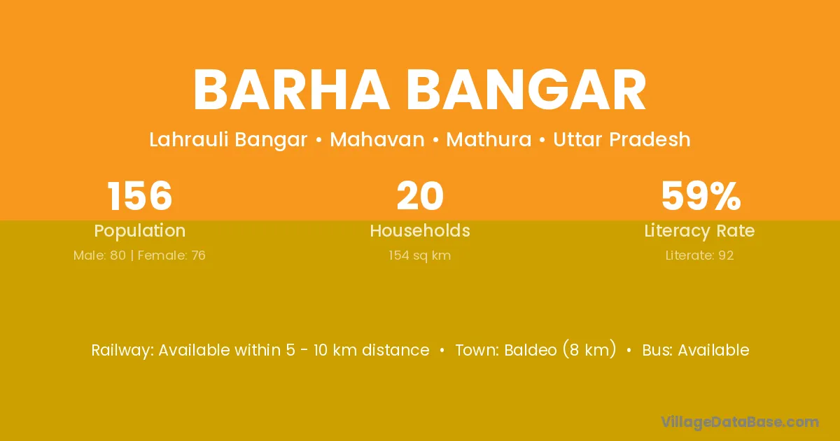Baldeo (8 km) is the nearest town to Barha Bangar village for major economic activities and is located approximately 8 km away.