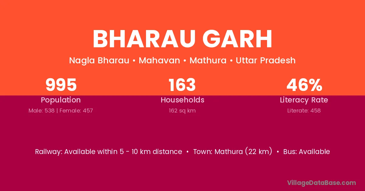 Mathura (22 km) is the nearest town to Bharau Garh village for major economic activities and is located approximately 22 km away.