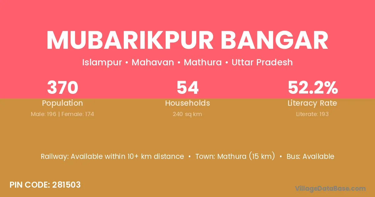 Mathura (15 km) is the nearest town to Mubarikpur Bangar village for major economic activities and is located approximately 15 km away.