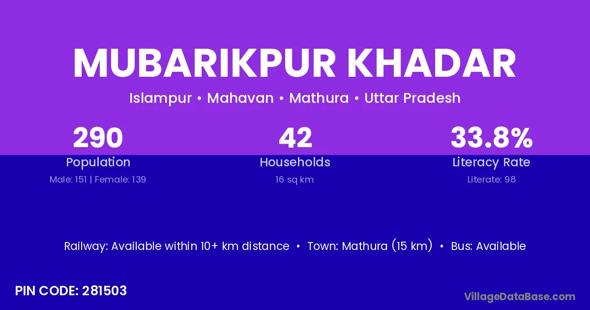 Mathura (15 km) is the nearest town to Mubarikpur Khadar village for major economic activities and is located approximately 15 km away.