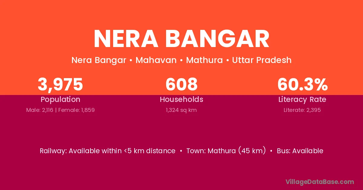Mathura (45 km) is the nearest town to Nera Bangar village for major economic activities and is located approximately 45 km away.