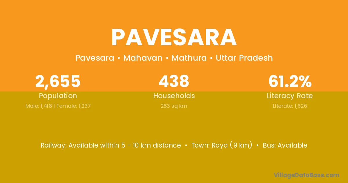 Raya (9 km) is the nearest town to Pavesara village for major economic activities and is located approximately 9 km away.