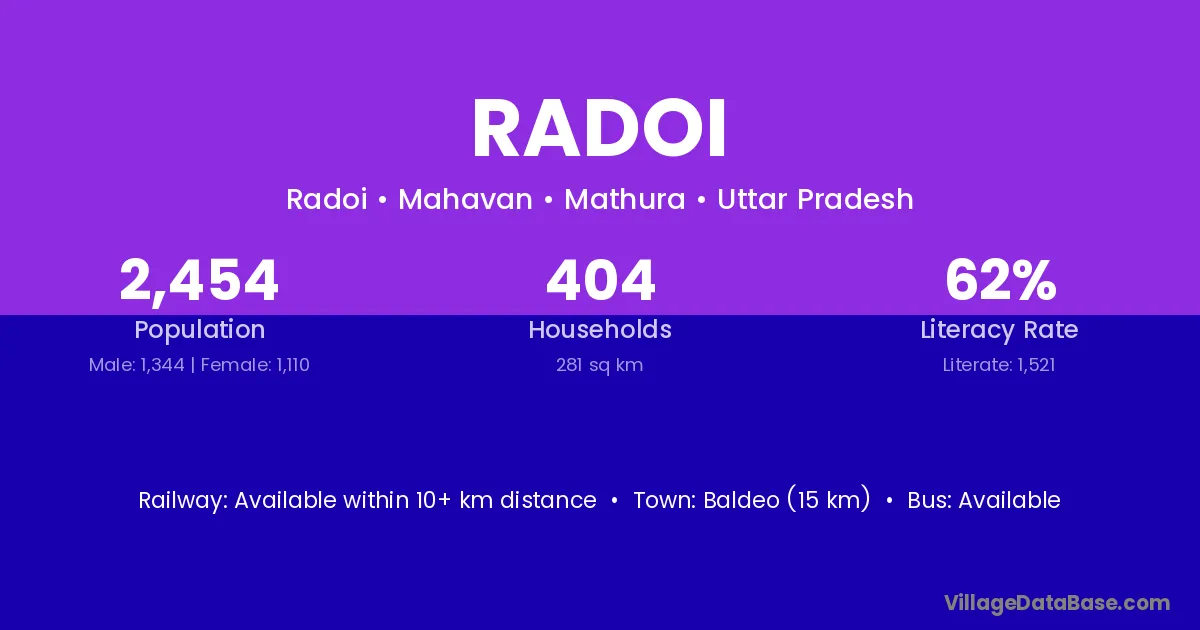 Radoi village has a total population of 2,454 people, of which 1,344 are males and 1,110 are females.