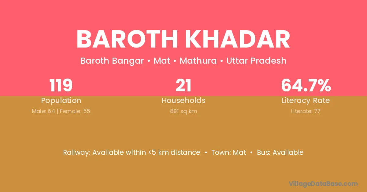 Baroth Khadar village has a total population of 119 people, of which 64 are males and 55 are females.