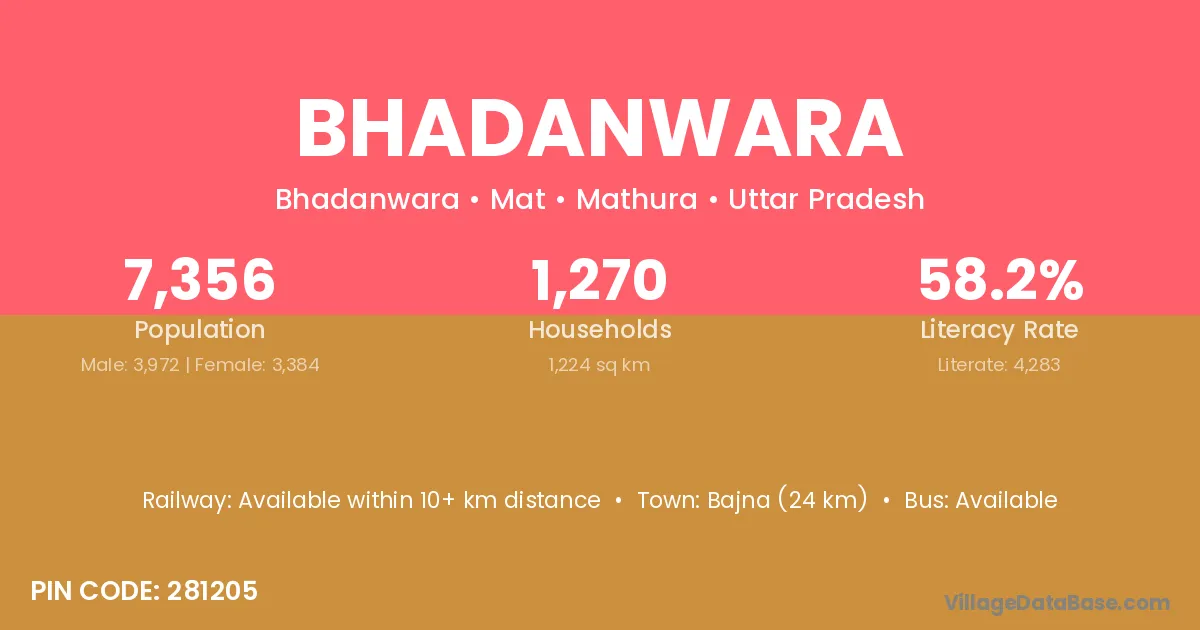 Bajna (24 km) is the nearest town to Bhadanwara village for major economic activities and is located approximately 24 km away.