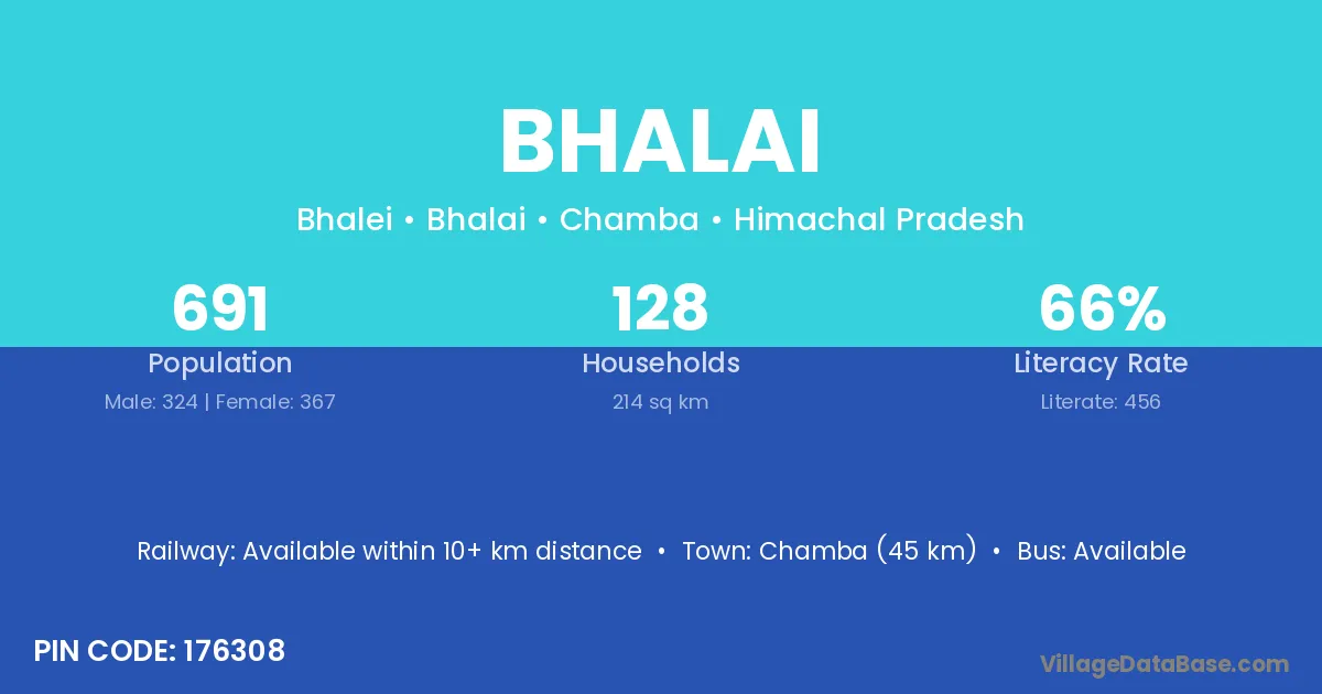 The literacy rate of Bhalai village is 57.42%. Male literacy stands at 68.77% and female literacy at 44.01%.