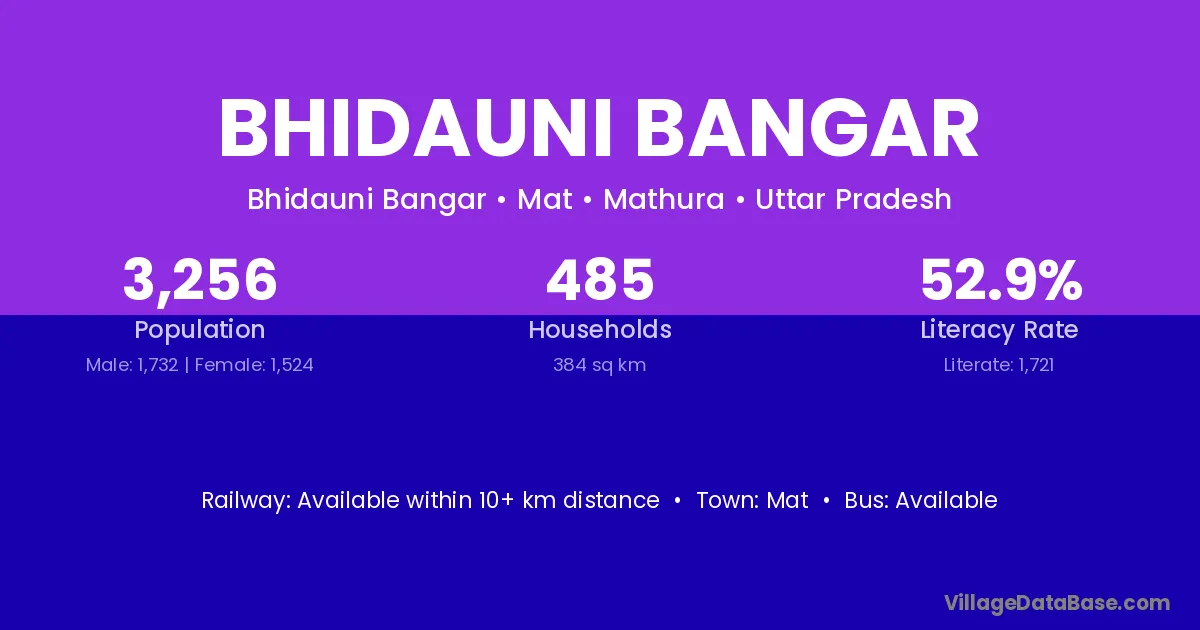Bhidauni Bangar village has a total population of 3,256 people, of which 1,732 are males and 1,524 are females.
