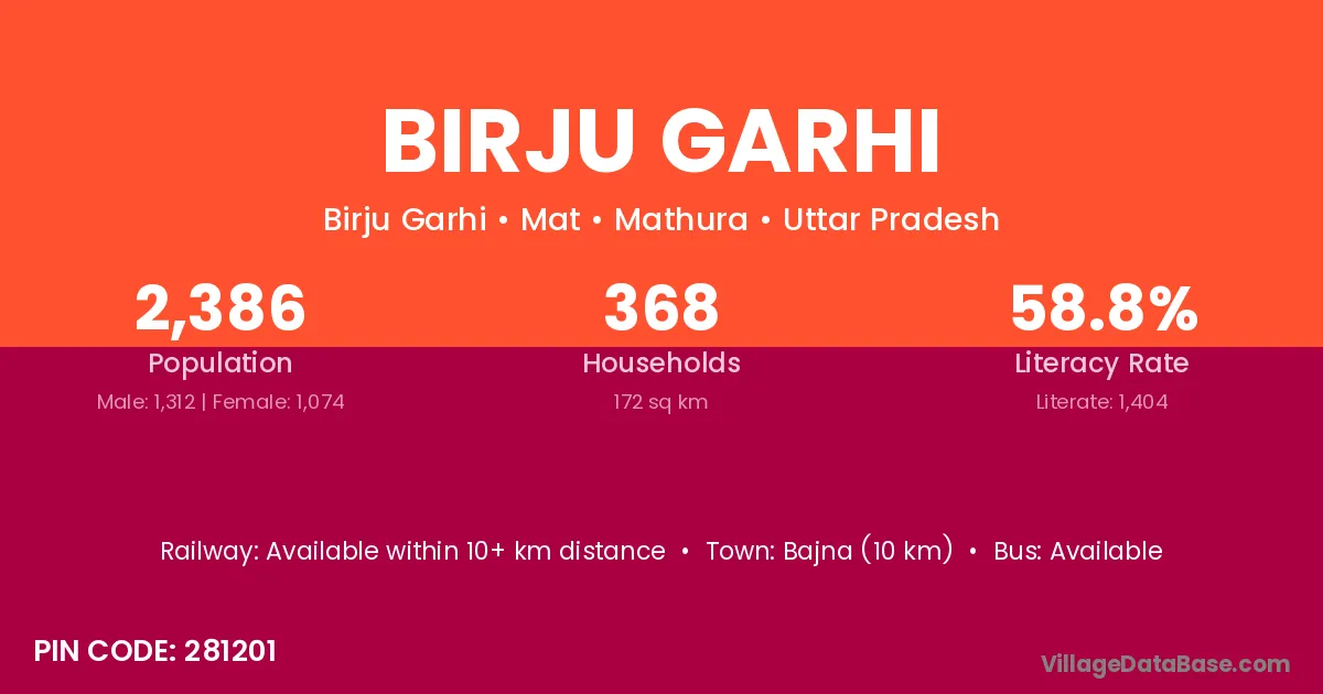 Bajna (10 km) is the nearest town to Birju Garhi village for major economic activities and is located approximately 10 km away.