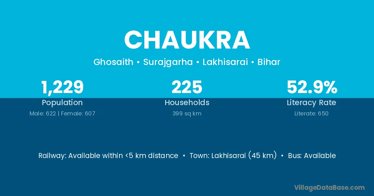 The literacy rate of Chaukra village is 59.44%. Male literacy stands at 68.01% and female literacy at 49.12%.