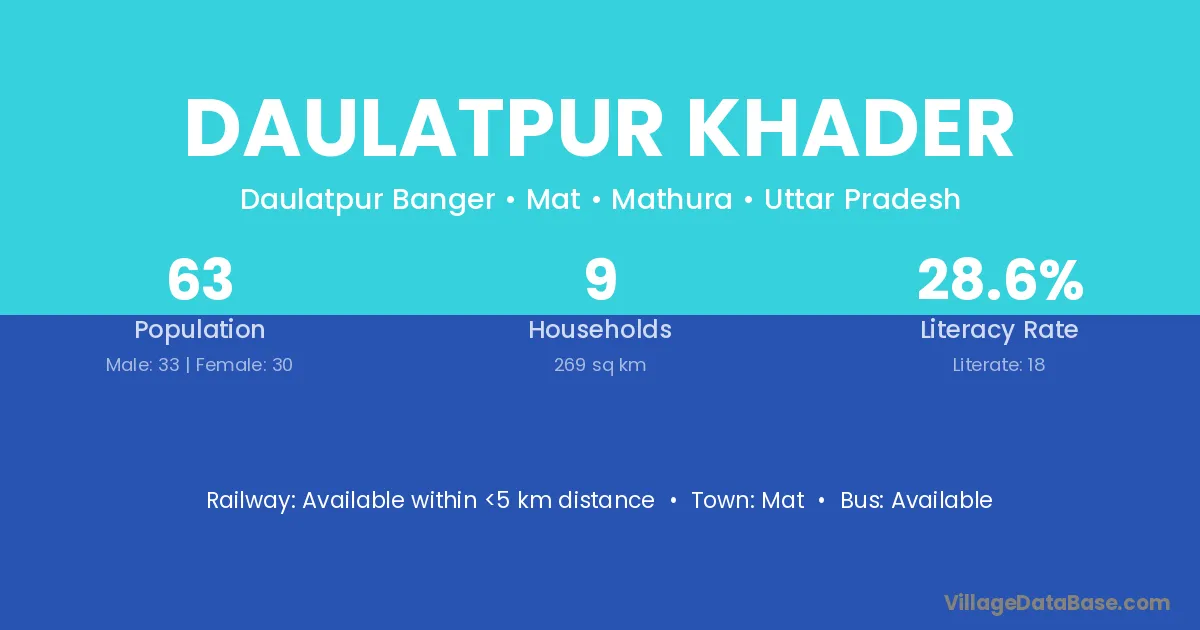 Daulatpur Khader village has a total population of 63 people, of which 33 are males and 30 are females.