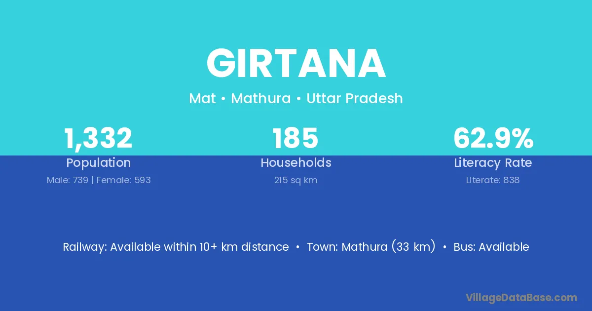 Mathura (33 km) is the nearest town to Girtana village for major economic activities and is located approximately 33 km away.