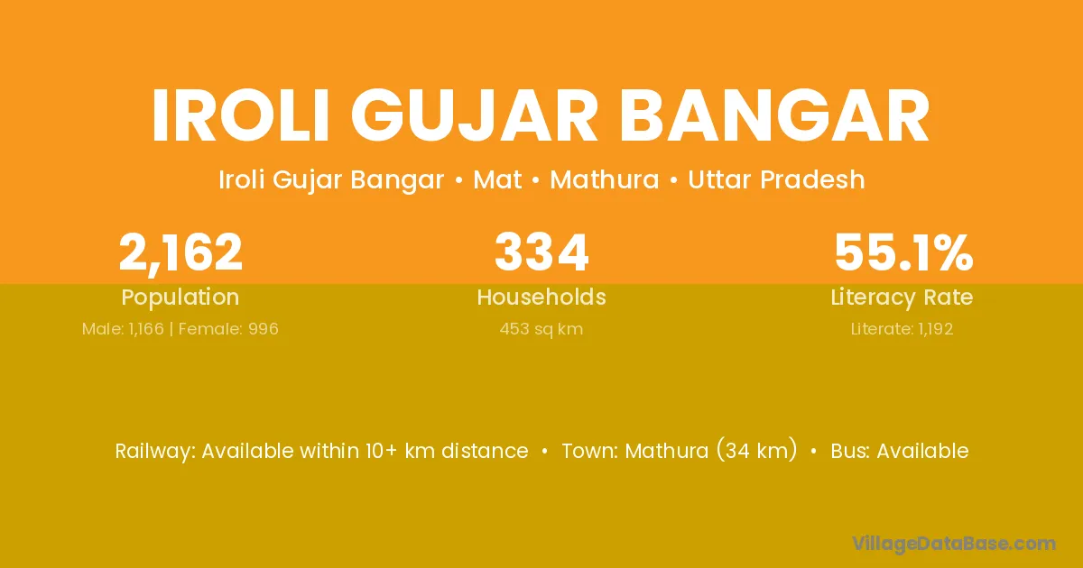 Mathura (34 km) is the nearest town to Iroli Gujar Bangar village for major economic activities and is located approximately 34 km away.