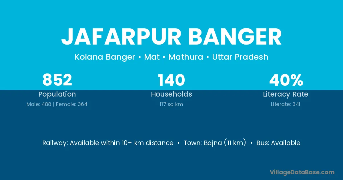 Bajna (11 km) is the nearest town to Jafarpur Banger village for major economic activities and is located approximately 11 km away.