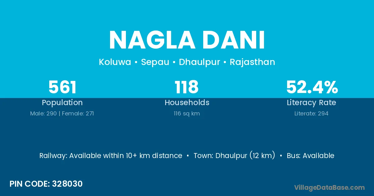 The literacy rate of Nagla Dani village is 65.73%. Male literacy stands at 69.11% and female literacy at 61.82%.