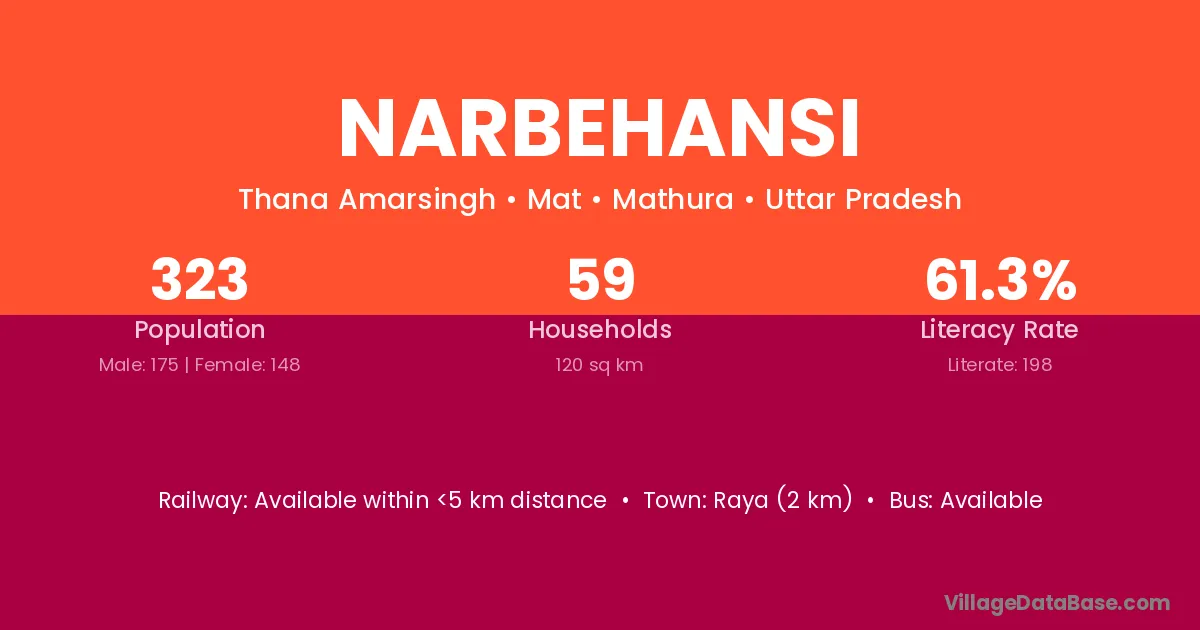 Raya (2 km) is the nearest town to Narbehansi village for major economic activities and is located approximately 2 km away.