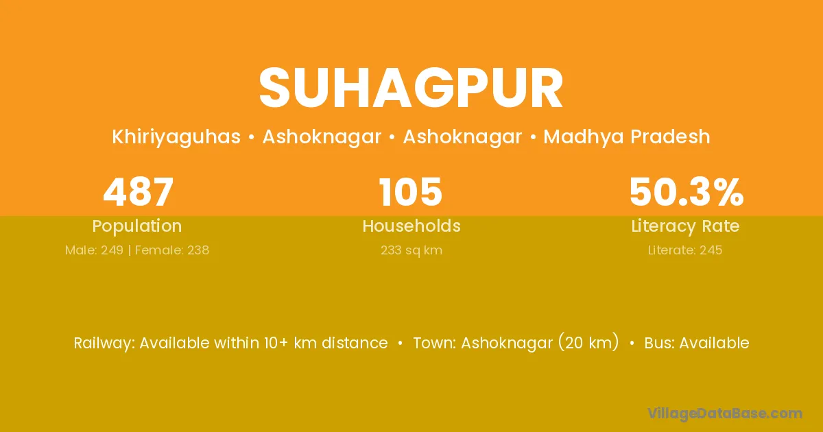 Bajna (8 km) is the nearest town to Suhagpur village for major economic activities and is located approximately 8 km away.