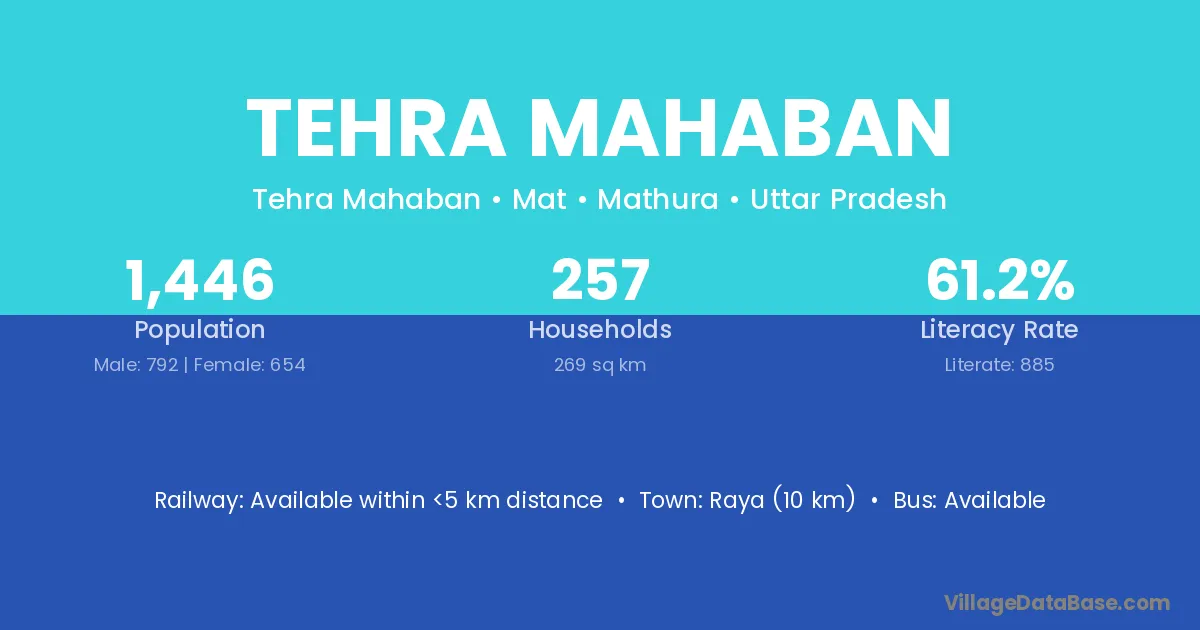 Raya (10 km) is the nearest town to Tehra Mahaban village for major economic activities and is located approximately 10 km away.