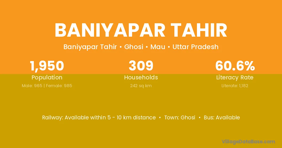 Baniyapar Tahir village has a total population of 1,950 people, of which 965 are males and 985 are females.