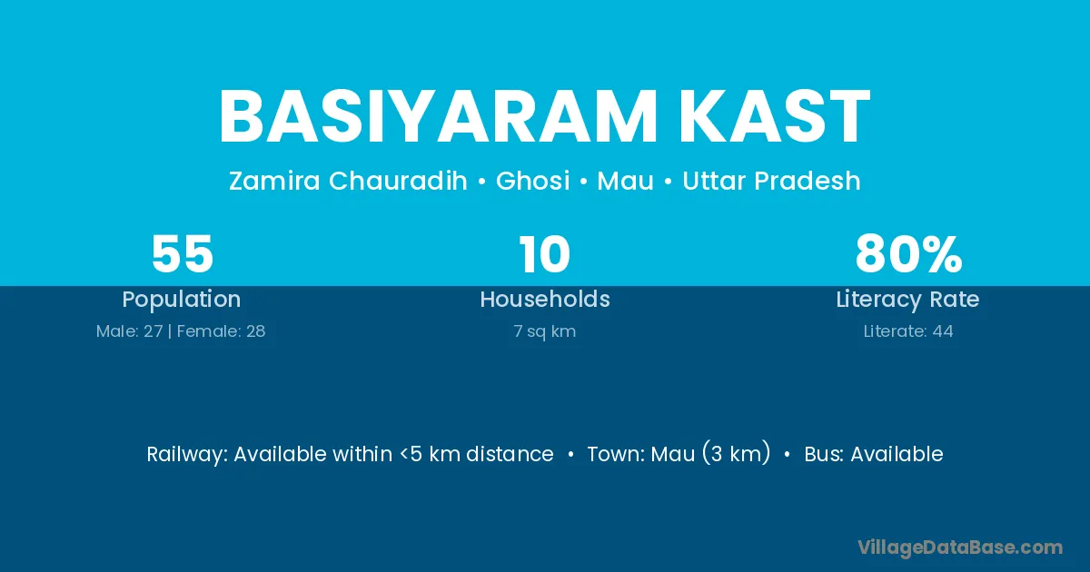 Mau (3 km) is the nearest town to Basiyaram Kast village for major economic activities and is located approximately 3 km away.
