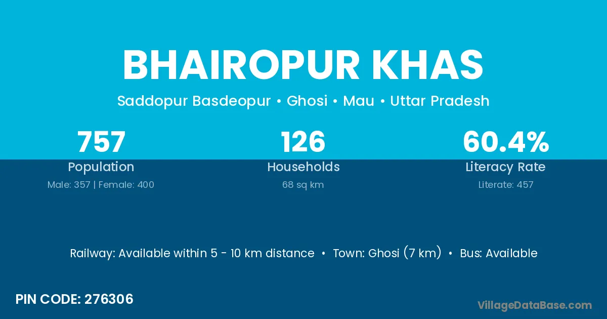 Ghosi (7 km) is the nearest town to Bhairopur Khas village for major economic activities and is located approximately 7 km away.