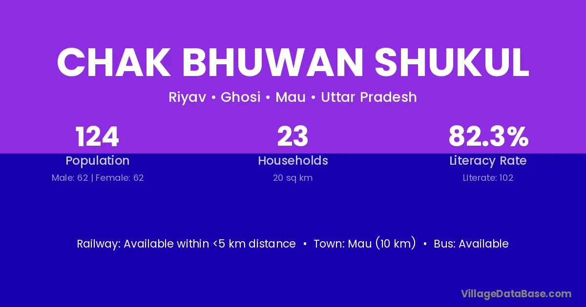 Chak Bhuwan Shukul village has a total population of 124 people, of which 62 are males and 62 are females.