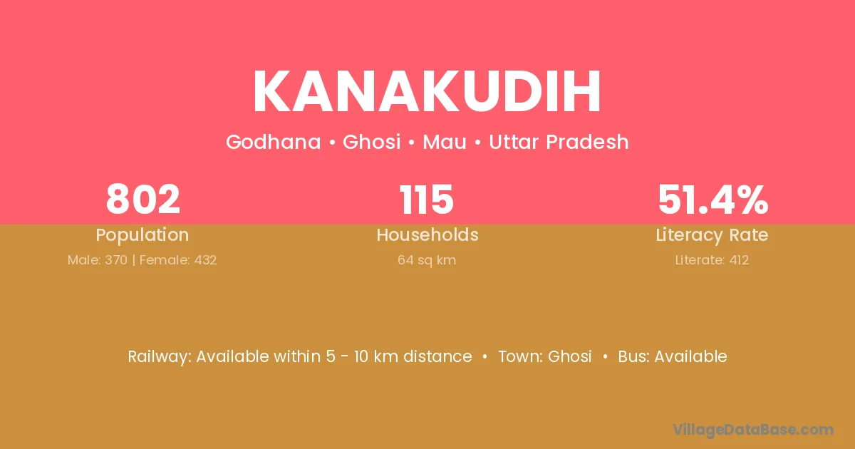 Kanakudih village has a total population of 802 people, of which 370 are males and 432 are females.