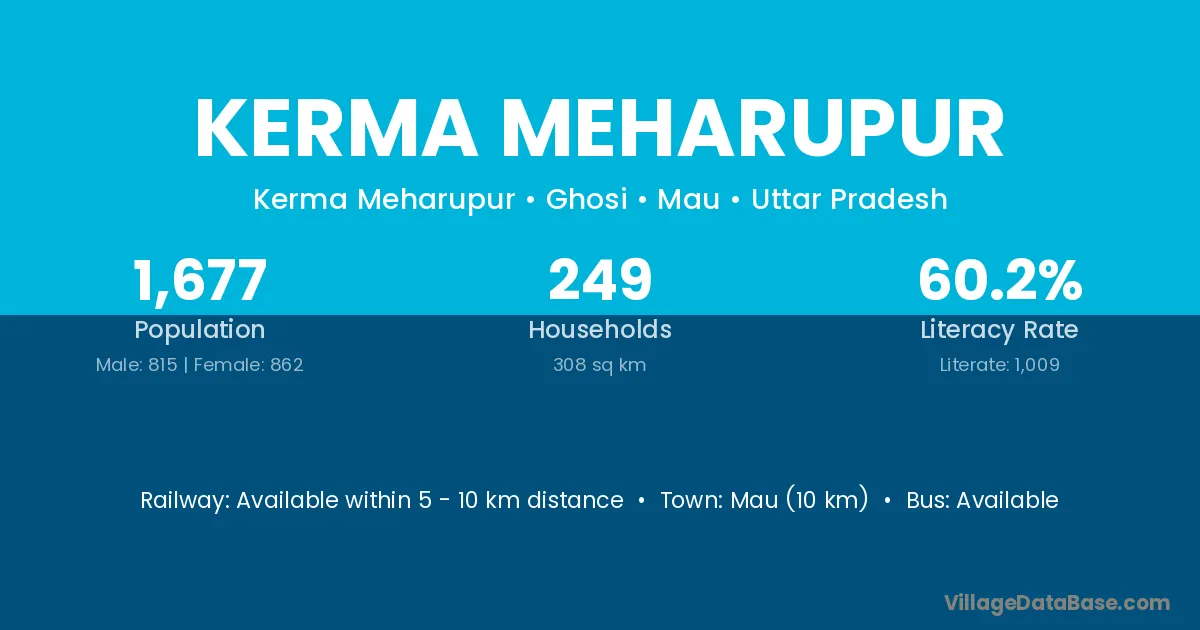 Mau (10 km) is the nearest town to Kerma Meharupur village for major economic activities and is located approximately 10 km away.