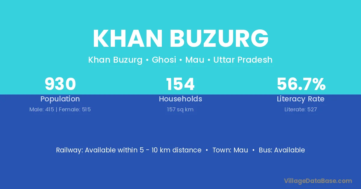 Khan Buzurg village has a total population of 930 people, of which 415 are males and 515 are females.