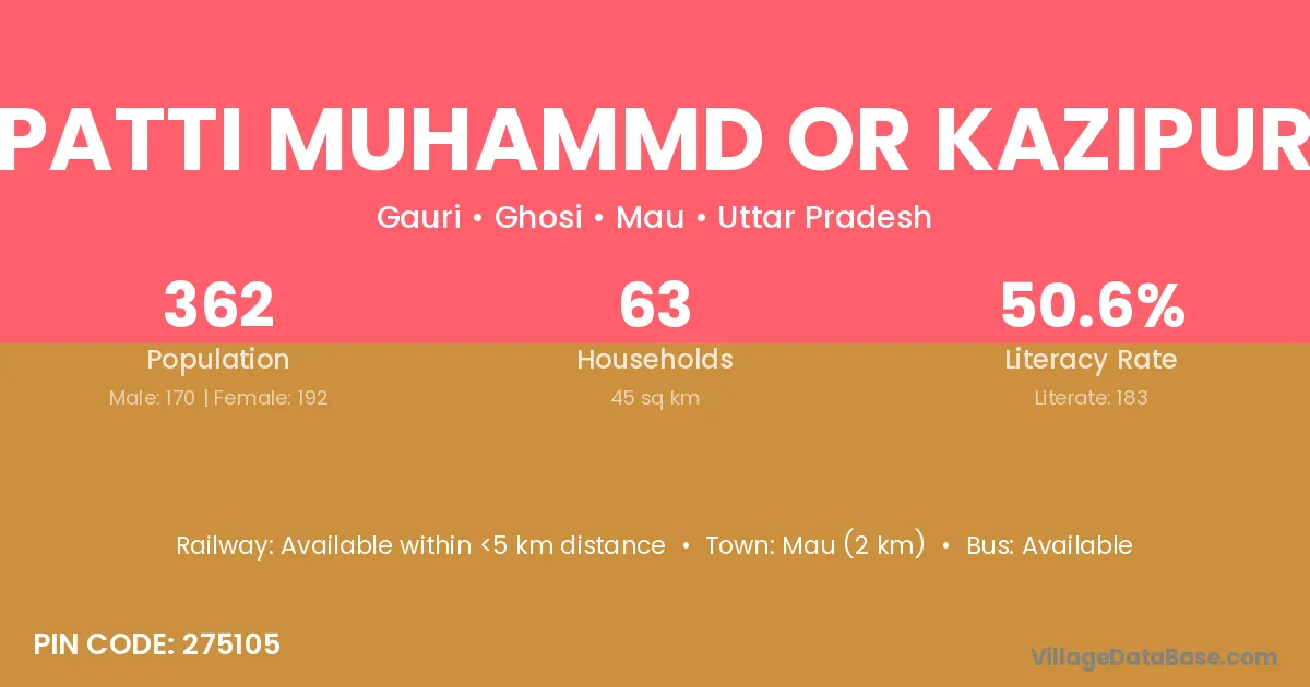 Mau (2 km) is the nearest town to Patti Muhammd Or Kazipur village for major economic activities and is located approximately 2 km away.