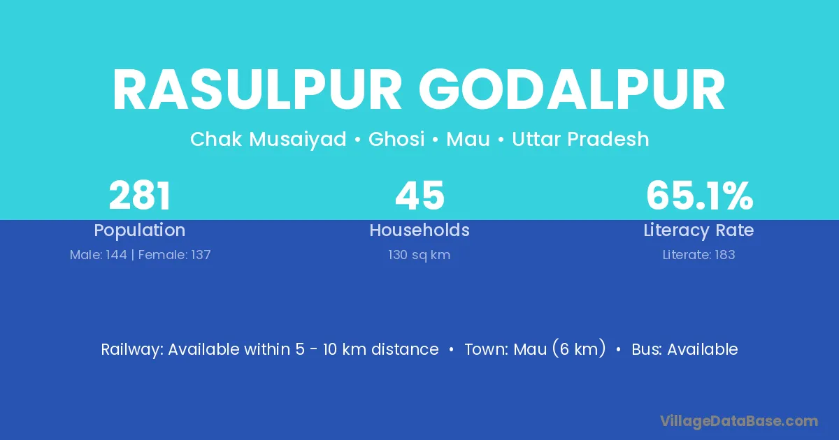 Mau (6 km) is the nearest town to Rasulpur Godalpur village for major economic activities and is located approximately 6 km away.