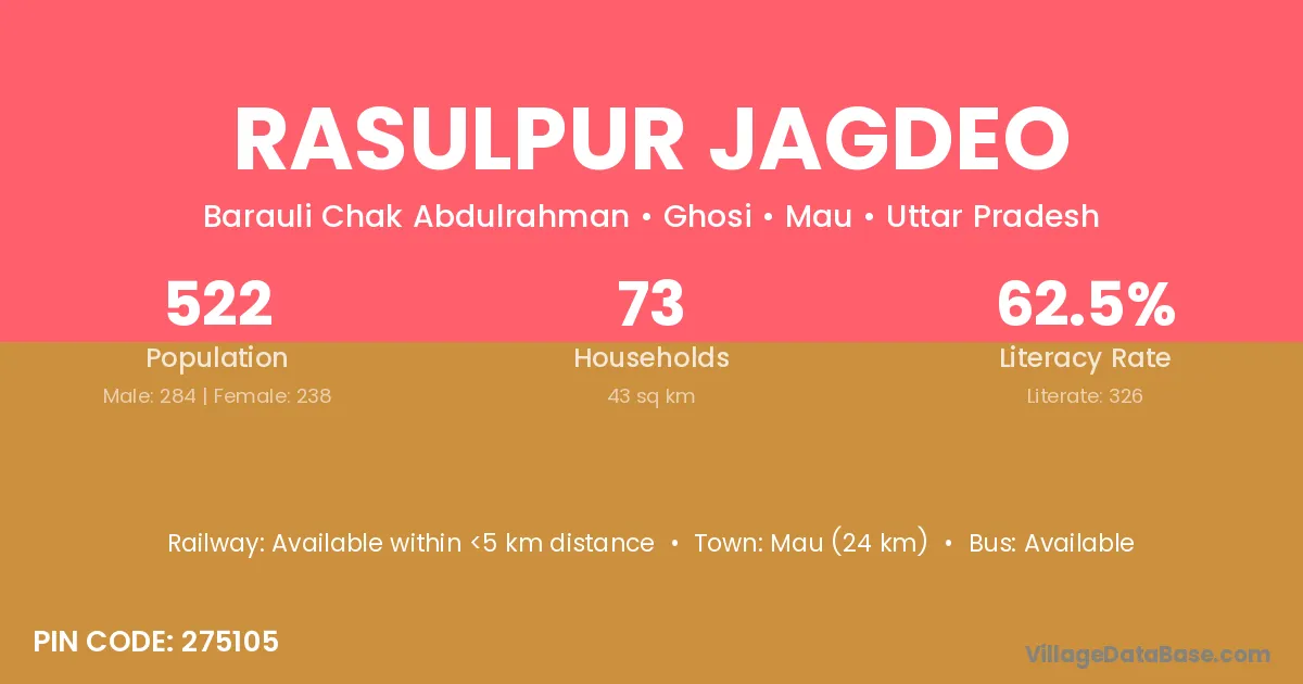 Mau (24 km) is the nearest town to Rasulpur Jagdeo village for major economic activities and is located approximately 24 km away.
