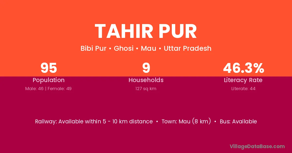 Tahir Pur village has a total population of 95 people, of which 46 are males and 49 are females.