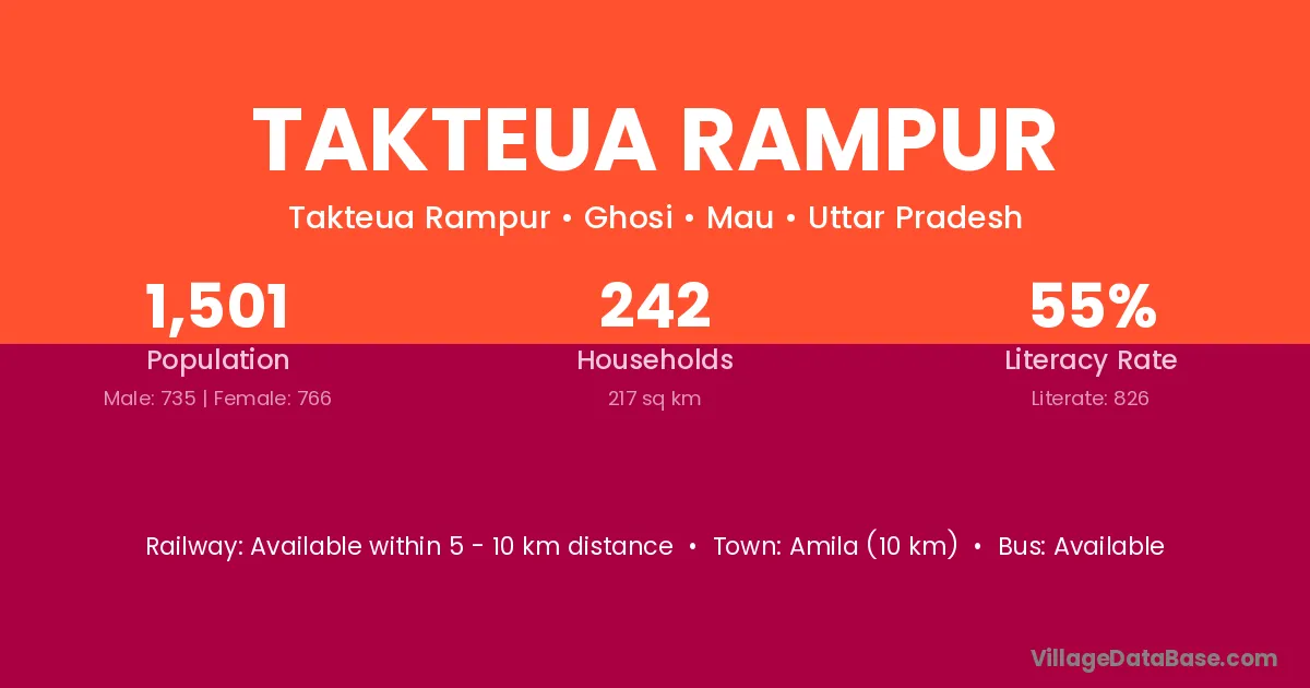 Takteua Rampur village has a total population of 1,501 people, of which 735 are males and 766 are females.