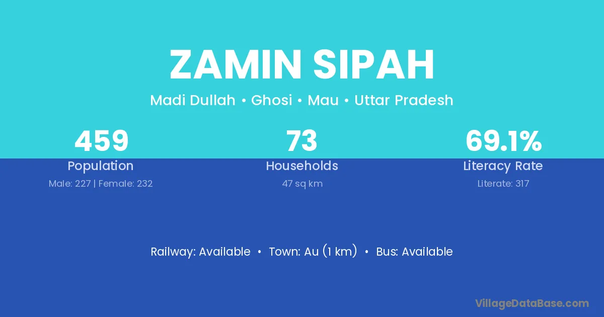 Zamin Sipah village has a total population of 459 people, of which 227 are males and 232 are females.