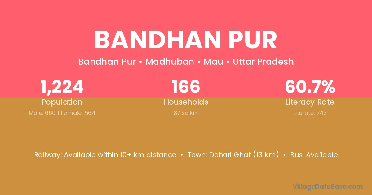 Dohari Ghat (13 km) is the nearest town to Bandhan Pur village for major economic activities and is located approximately 13 km away.